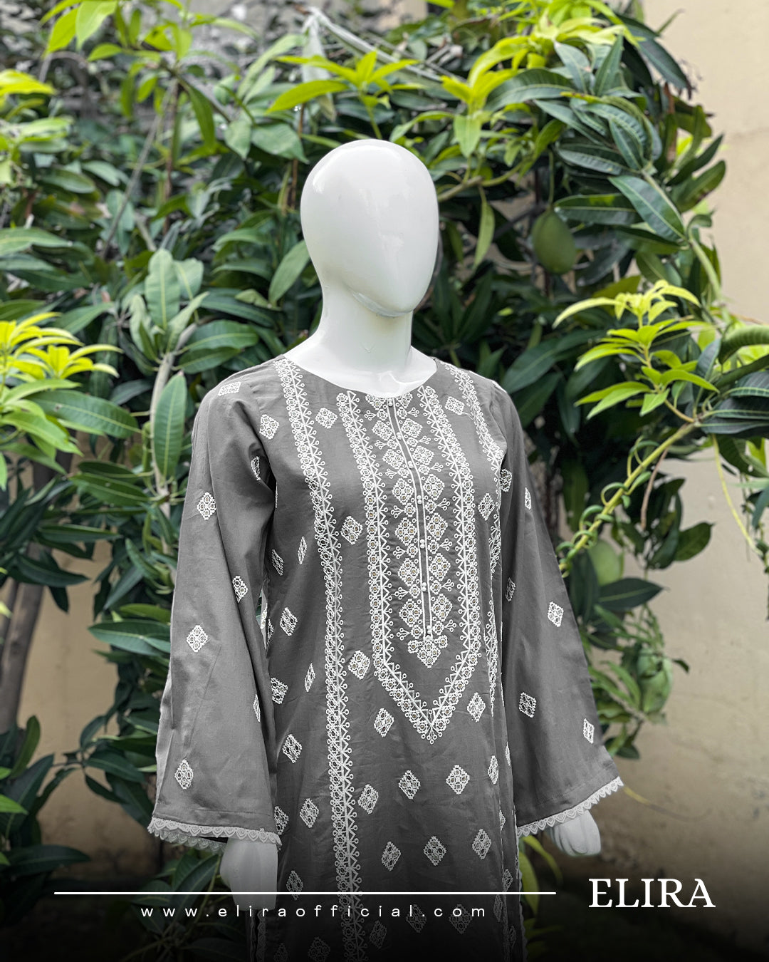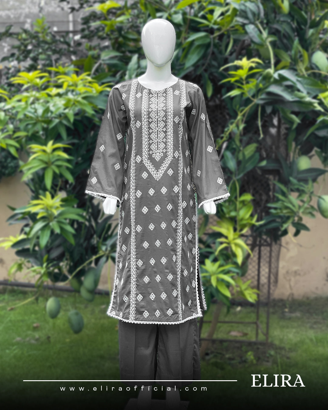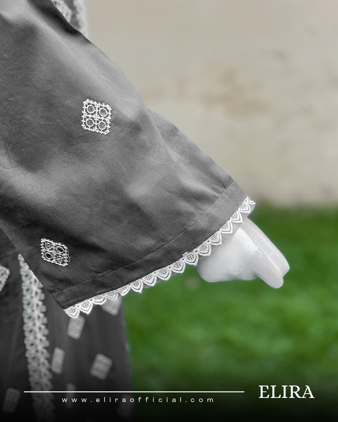 Description: A straight black embroidered shirt featuring front, back, and sleeve embroidery, full sleeves with lace inserts layered over organza, and a round neckline. Finished with lace detailing layered over organza on the hem and edges.