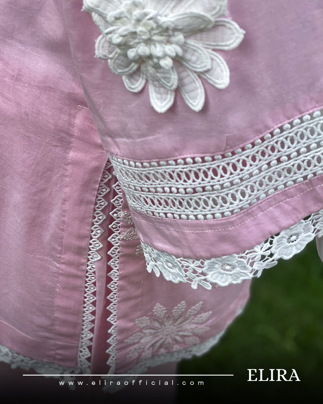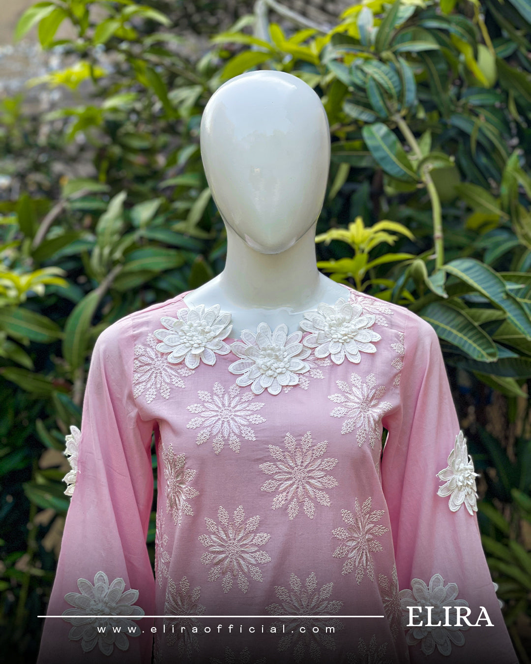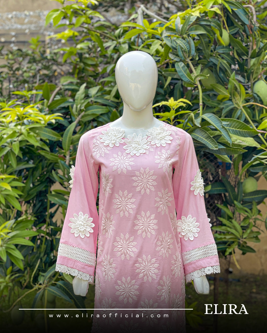 Description: A short straight shirt adorned with floral embroidery on the front, back, and sleeves. It features full sleeves highlighted with 3D floral lace. The shirt is detailed with lace on the sleeve edges, hemline, and all around the shirt’s borders. The round neckline is also embellished with 3D flower lace, giving it a finished and elegant look.