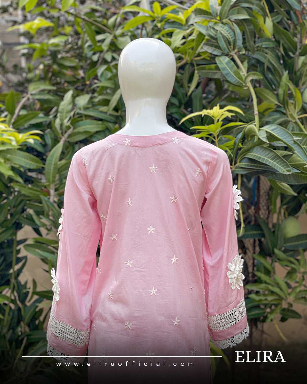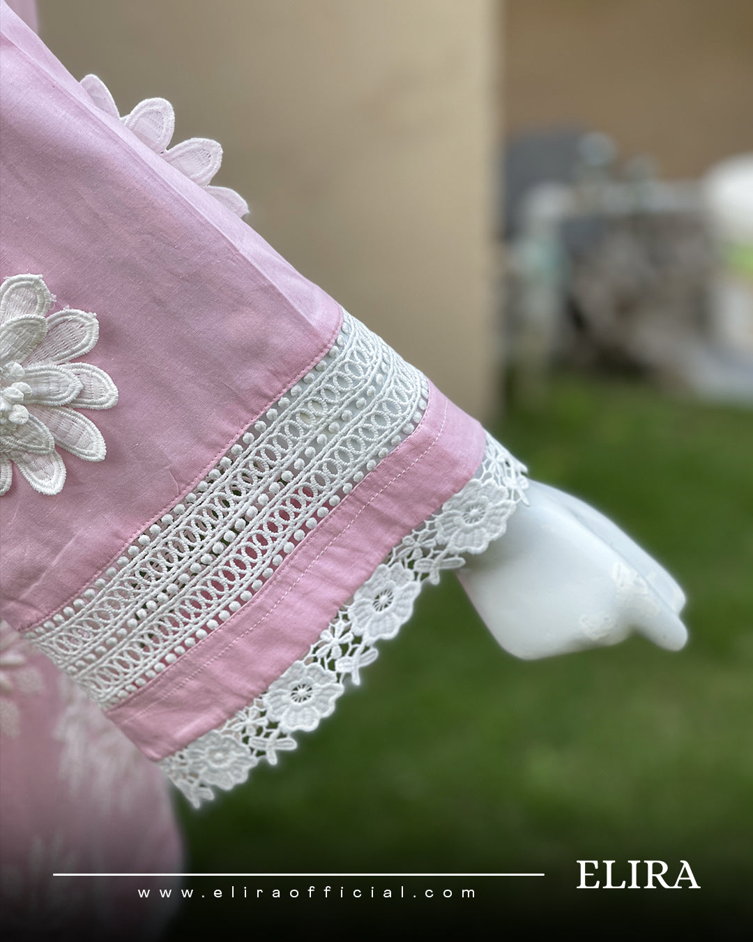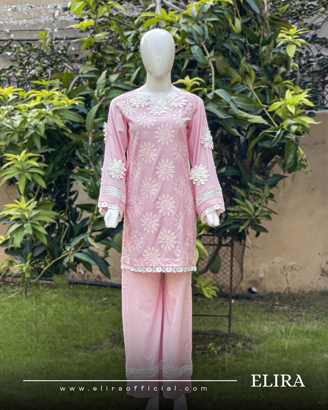 Description: A short straight shirt adorned with floral embroidery on the front, back, and sleeves. It features full sleeves highlighted with 3D floral lace. The shirt is detailed with lace on the sleeve edges, hemline, and all around the shirt’s borders. The round neckline is also embellished with 3D flower lace, giving it a finished and elegant look.