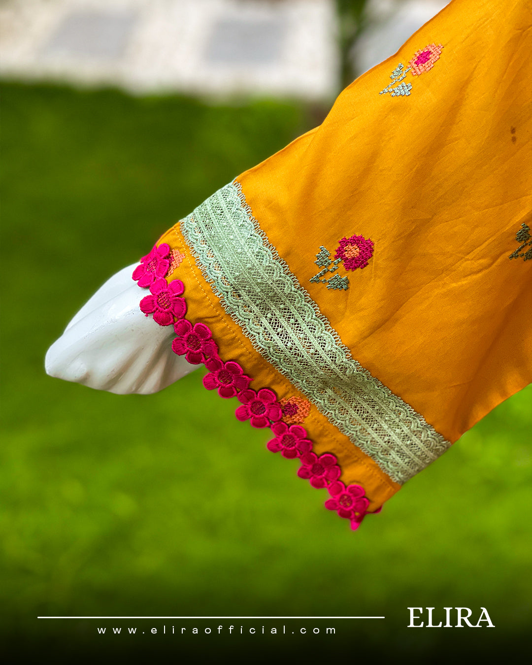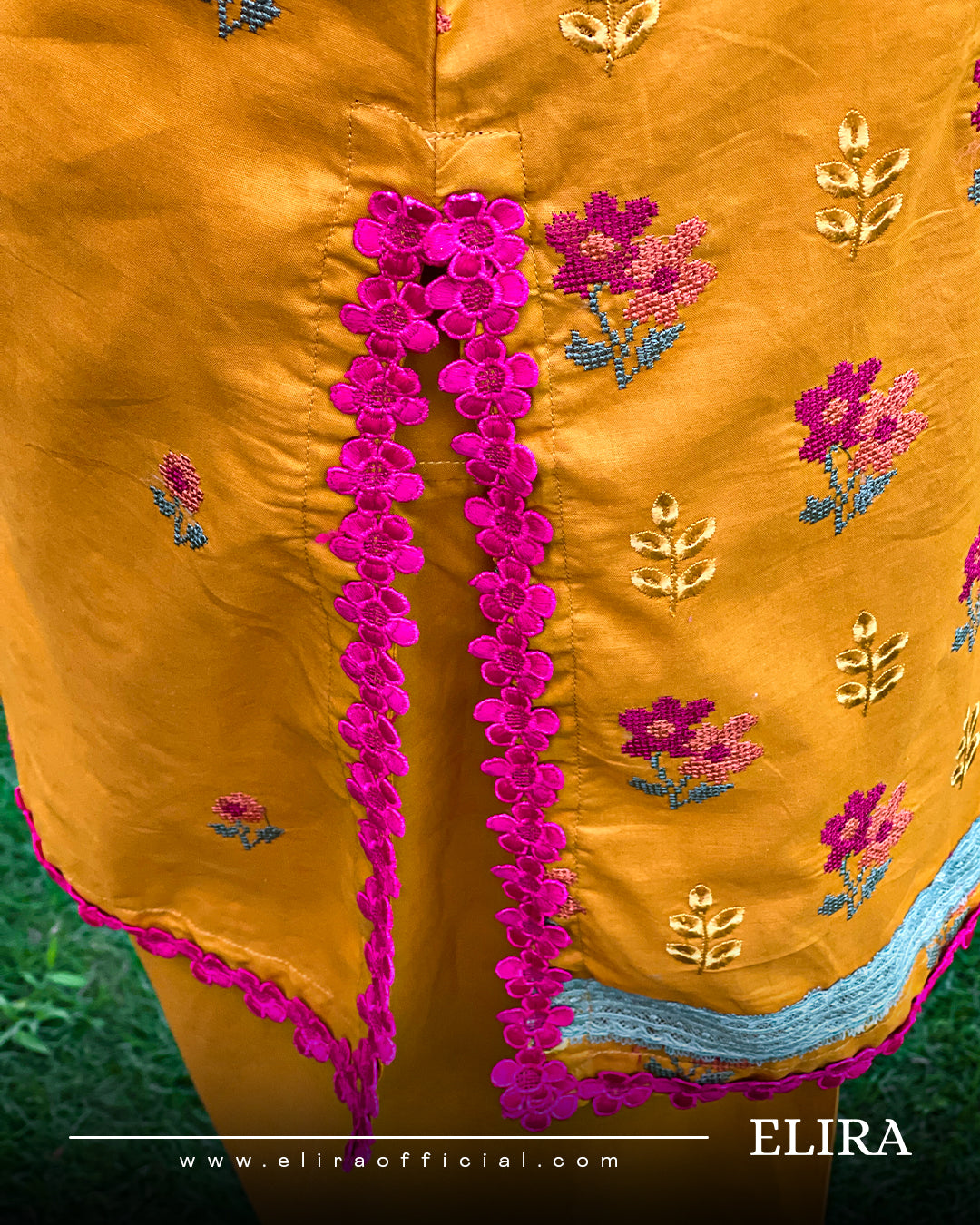 - Description: A shirt adorned with intricate floral embroidery across the front and sleeves. The neckline, cuffs, and hem are finished with floral lace that adds a delicate, handcrafted charm. Full-length sleeves feature matching embroidered motifs, with lace accents enhancing the overall finesse of the design.