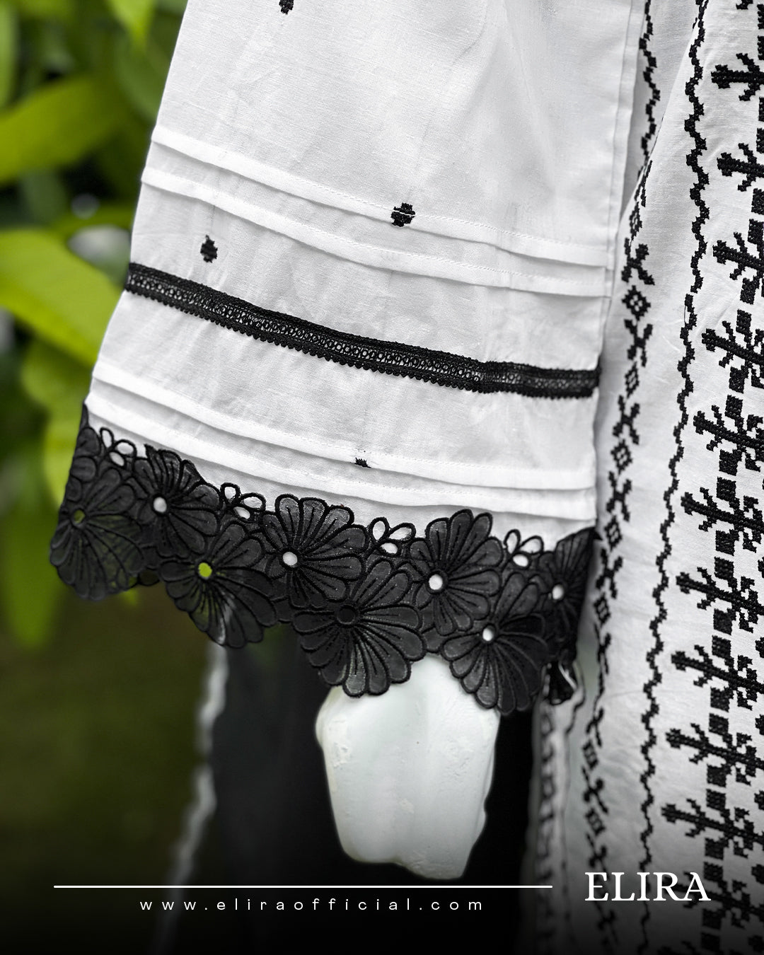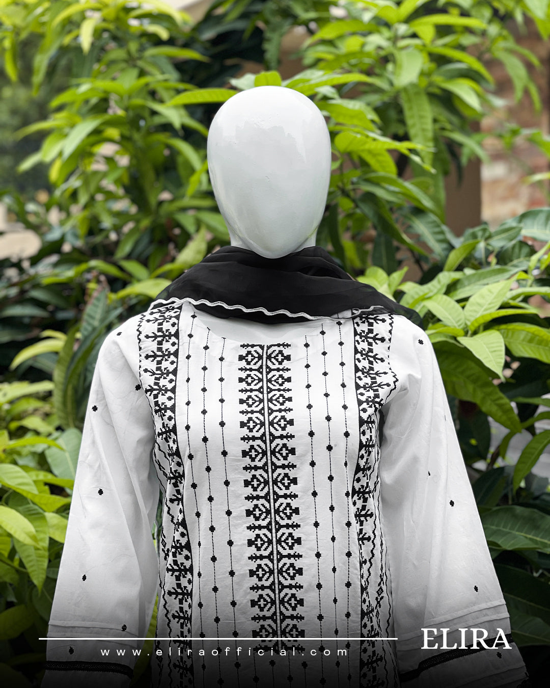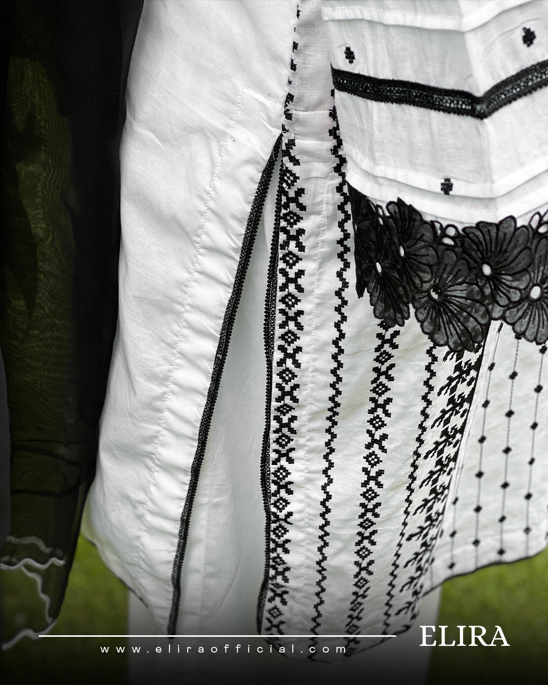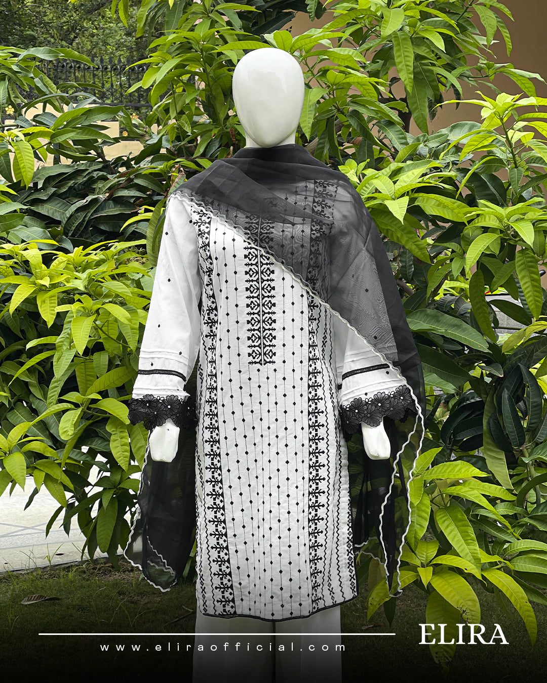 - Description: Black organza dupatta (2.5 yards) with white scalloped borders.