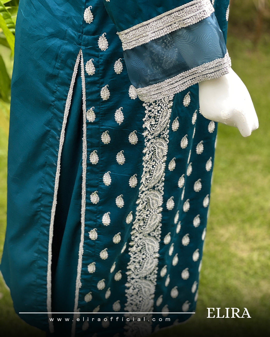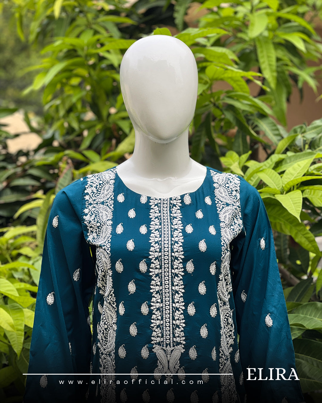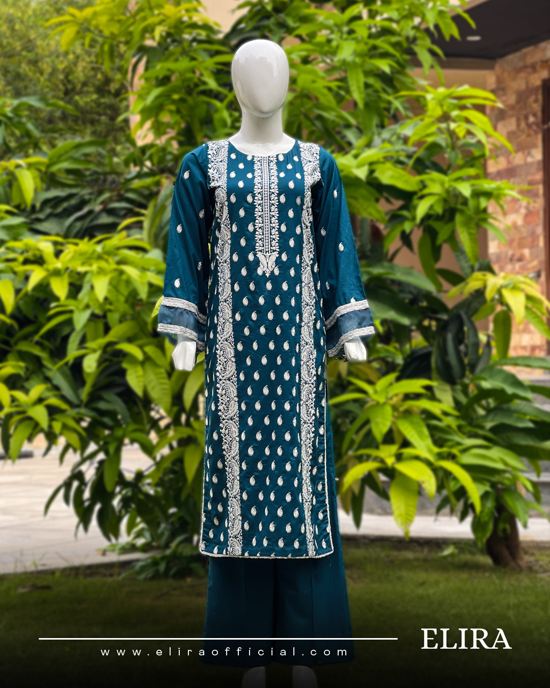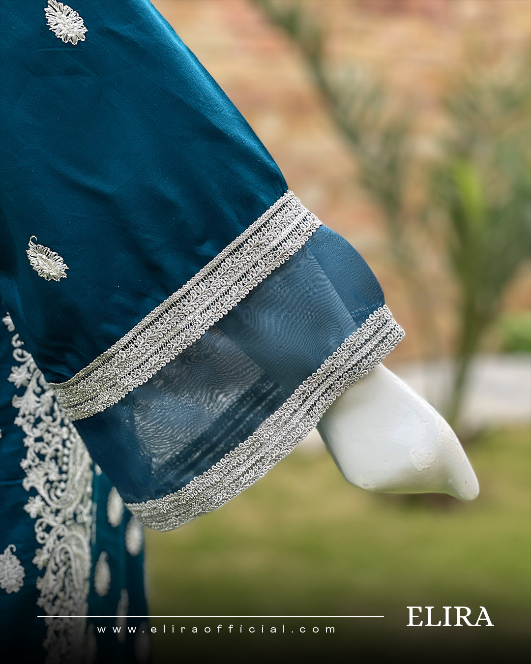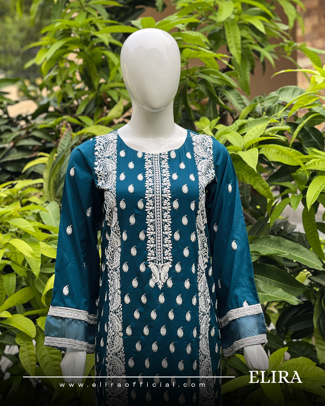 Description: Straight shirt with embroidered front and sleeves, paired with a plain back. Features full sleeves with lace and organza panels, a round neckline, and finishing lace accents on the hem and edges.